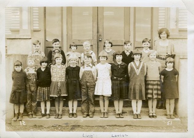 Second Row: #1, Lee Williamson; #2, George Manhart; #3, ?; #4, Leo Wallum; #5, Betty Merriam; #6, ?; #7, Harley Kirkman; #8, Miss Ellen Jacobson, teacher.