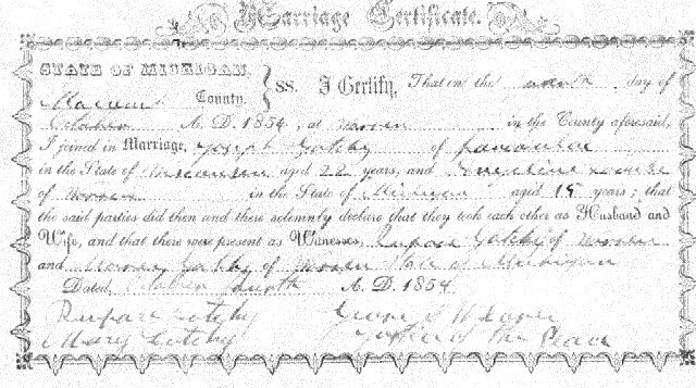Marriage Certificate of Joseph and Angeline Gotchy, October 4, 1854 in Warren, Macomb, MI. Witnesses were Rupaire and Mary Gotchy.