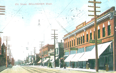 1200 block of Elk street; postmarked 1909.  Signs say McLeods, Elkans, Pantages Theatre